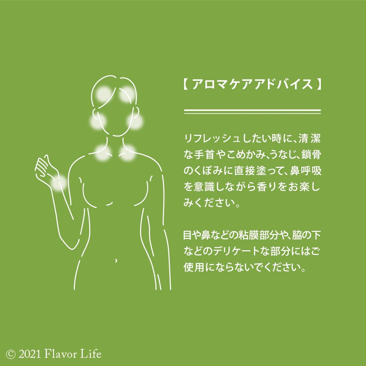 リフレッシュしたいときに、清潔な手首やこめかみ、うなじ、鎖骨のくぼみに直接塗って、鼻呼吸を意識しながら香りをお楽しみください。